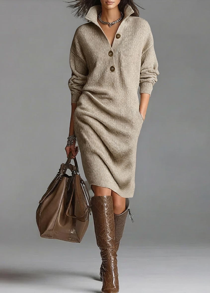 Lorena | Sukienka Dzianinowa z Kołnierzykiem i Guzikami